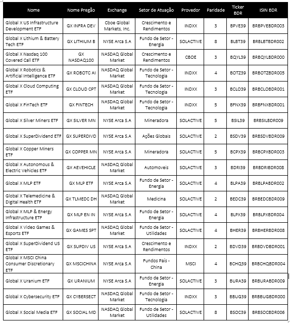 Quais são os BDRs de ETFs listados pela Global X