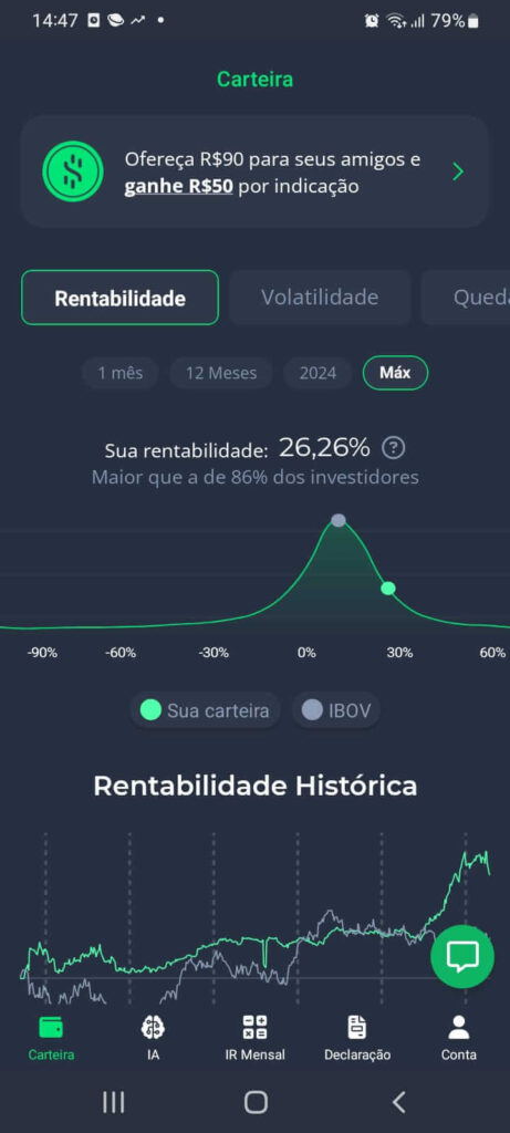 (*) O histograma do aplicativo Grana Capital compara a rentabilidade dos usuários em relação aos demais investidores nos períodos de: um mês, 12 meses, no ano corrente (ex. 2024), e máxima (desde a integração do aplicativo com os dados da B3). Dessa forma, é possível saber se a performance foi melhor ou pior que outras pessoas físicas, comparar com o desempenho do Ibovespa no mesmo período e avaliar sua estratégia. Veja o histograma (gráfico) na imagem abaixo: